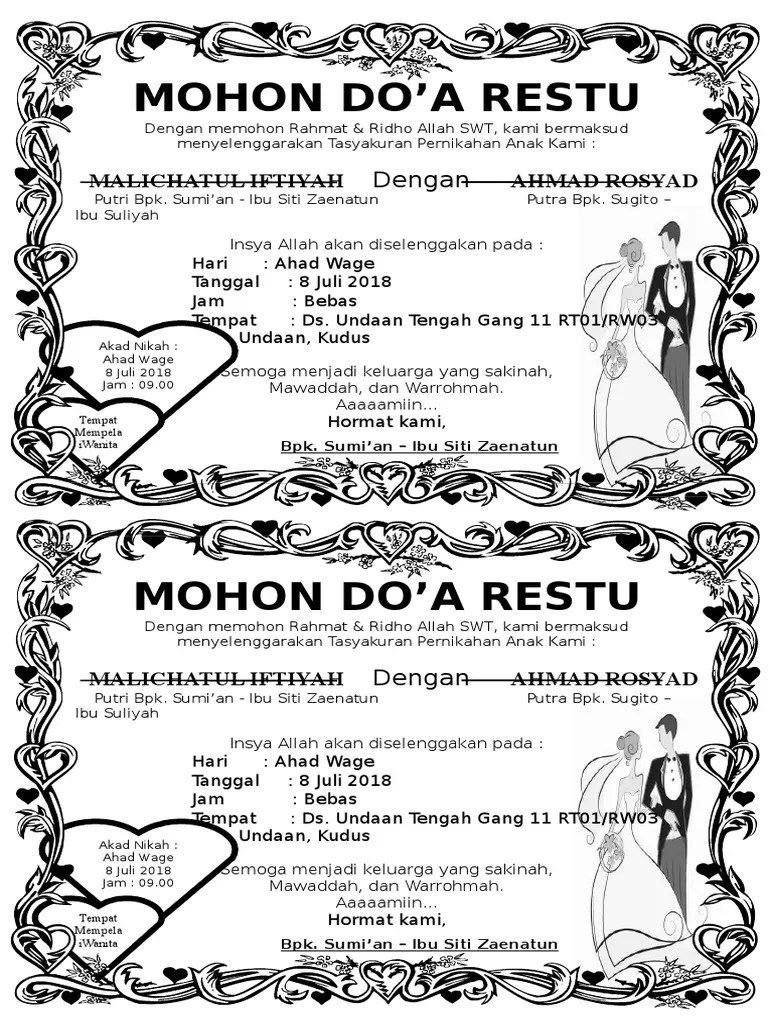 Kotak syukuran nikah 4 tutup besek budi 3. 1/4 a4 atau 14,85 cm x 10.5 silahkan setelah order isi data chat atau bisa ditambahkan . Kami berharap file undangan format doc ini bisa anda gunakan sebagai cotoh dengan frame atau bingka yang bagus dan cantik sehingga nampak . Contoh undangan pernikahan doc 10 contoh undangan. Ternyata, cukup banyak orang yang menginginkan template undangan perkawinan dalam format microsoft word (doc/docx).